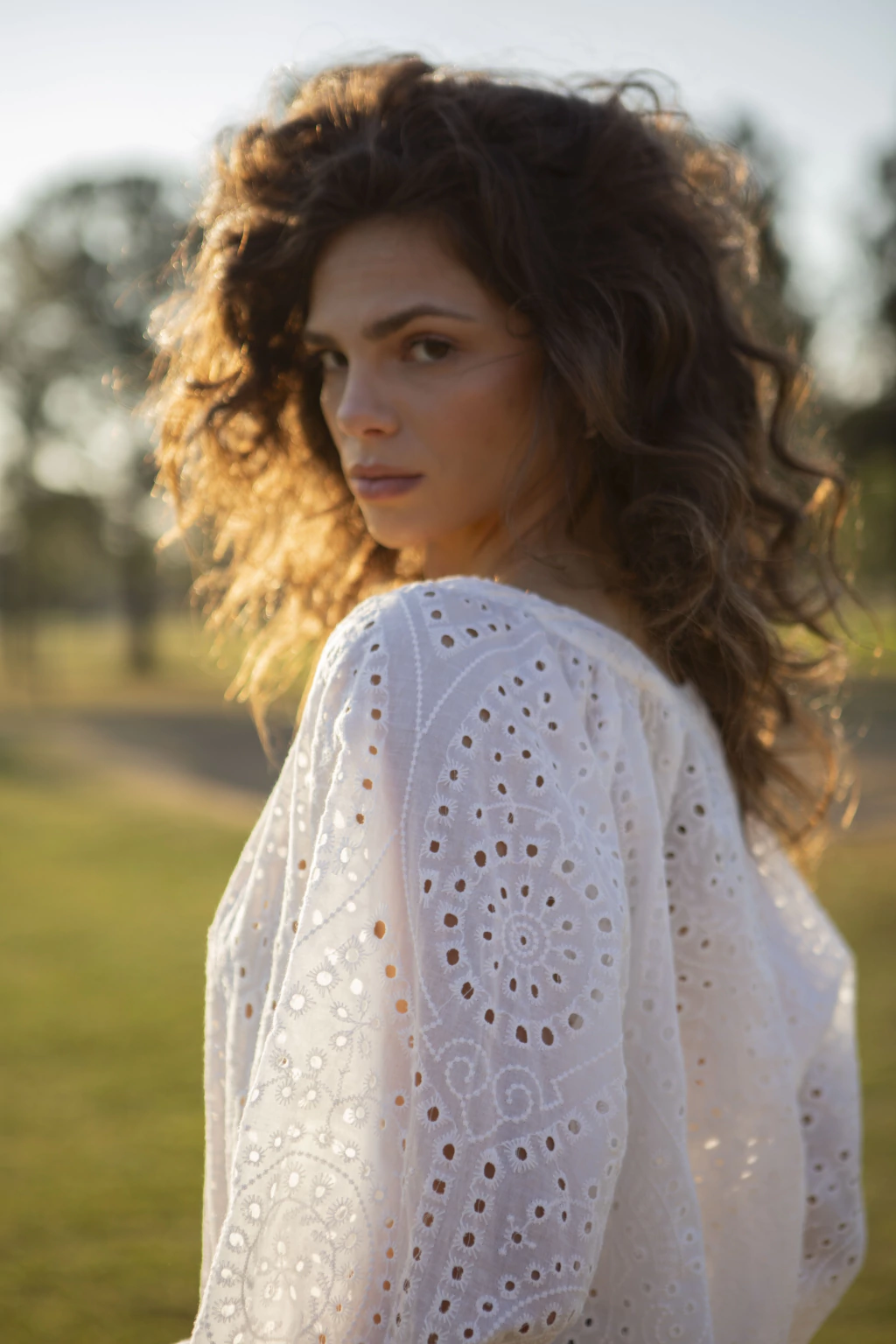 Blusa liviana con bordado calado y mangas amplias, perfecta para un look fresco y femenino con un toque bohemio y relajado.