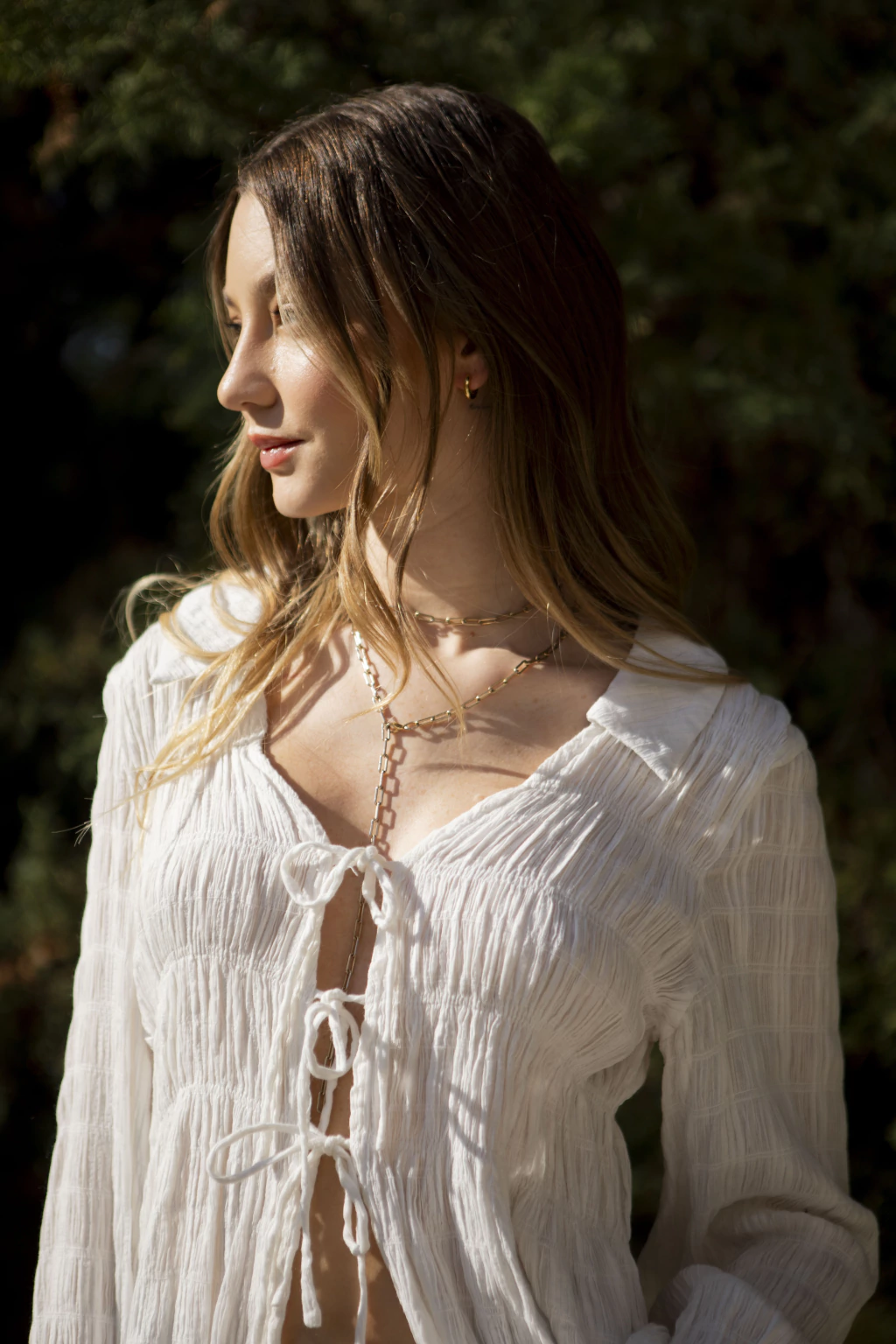 Blusa de manga larga con lazos frontales y escote en V, perfecta para un estilo femenino y relajado.