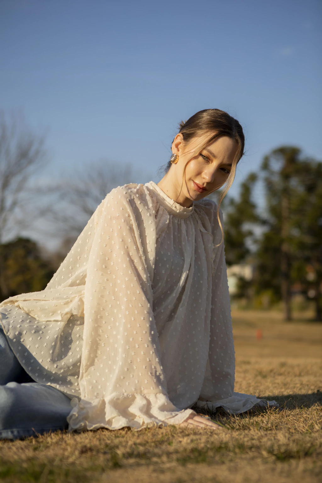 Blusa amplia de manga larga con textura sutil y cuello fruncido, ideal para un look romántico y elegante.