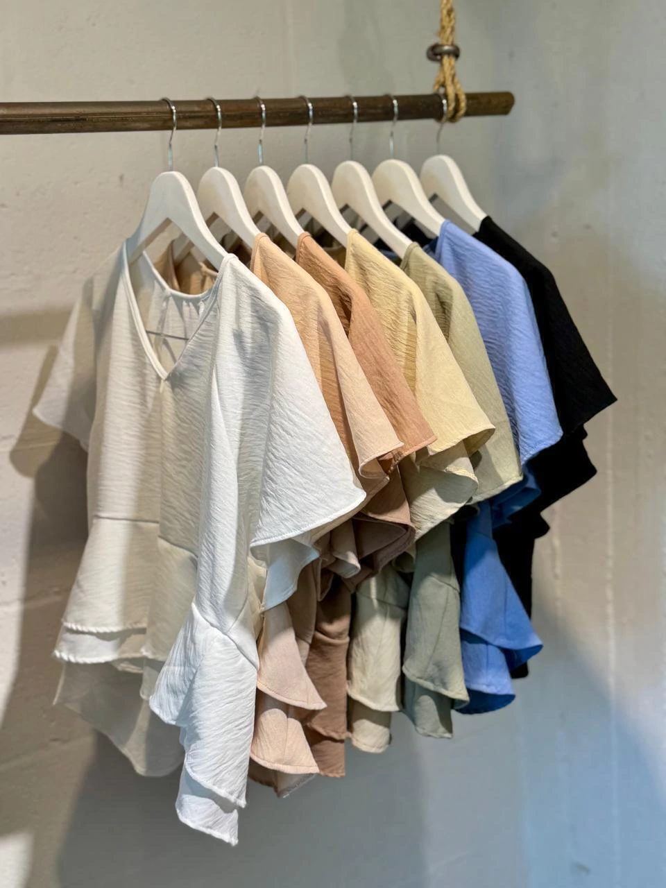 Blusa de arrugadito wang, con escote en V y mangas amplias terminadas en volado, que aportan movimiento y un toque femenino. De corte recto y liviano, ideal para usar tanto con jeans como con pantalones amplios. Su textura arrugada la hace fresca, práctica y con un aire descontracturado. Disponible en tonos neutros y pasteles.