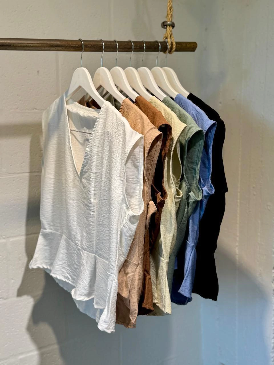 Blusas sin mangas con escote en V y volado en el ruedo, confeccionadas en tela liviana de textura arrugada. De calce suelto y femenino, disponibles en una paleta de tonos neutros y pasteles. Ideales para usar solas o debajo de camisas, perfectas para un look fresco y delicado.