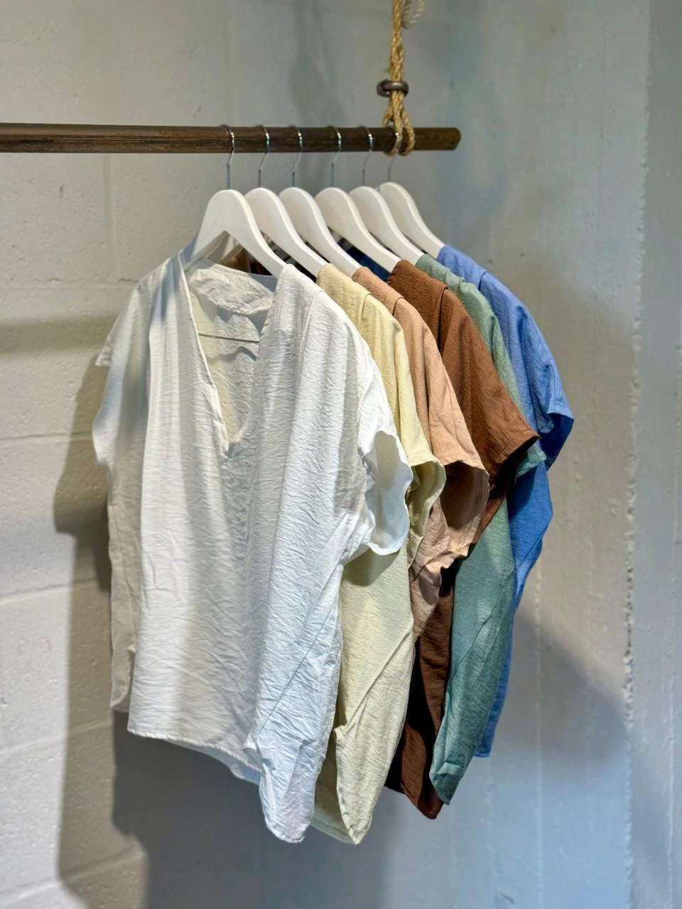 Remera de calce relajado con escote en V y mangas cortas. Confeccionada en un tejido con textura arrugada que le da un aspecto liviano y natural. Ideal para un look cómodo y canchero de todos los días. Disponible en una variedad de tonos neutros y pasteles que combinan fácilmente con jeans, shorts o pantalones amplios.