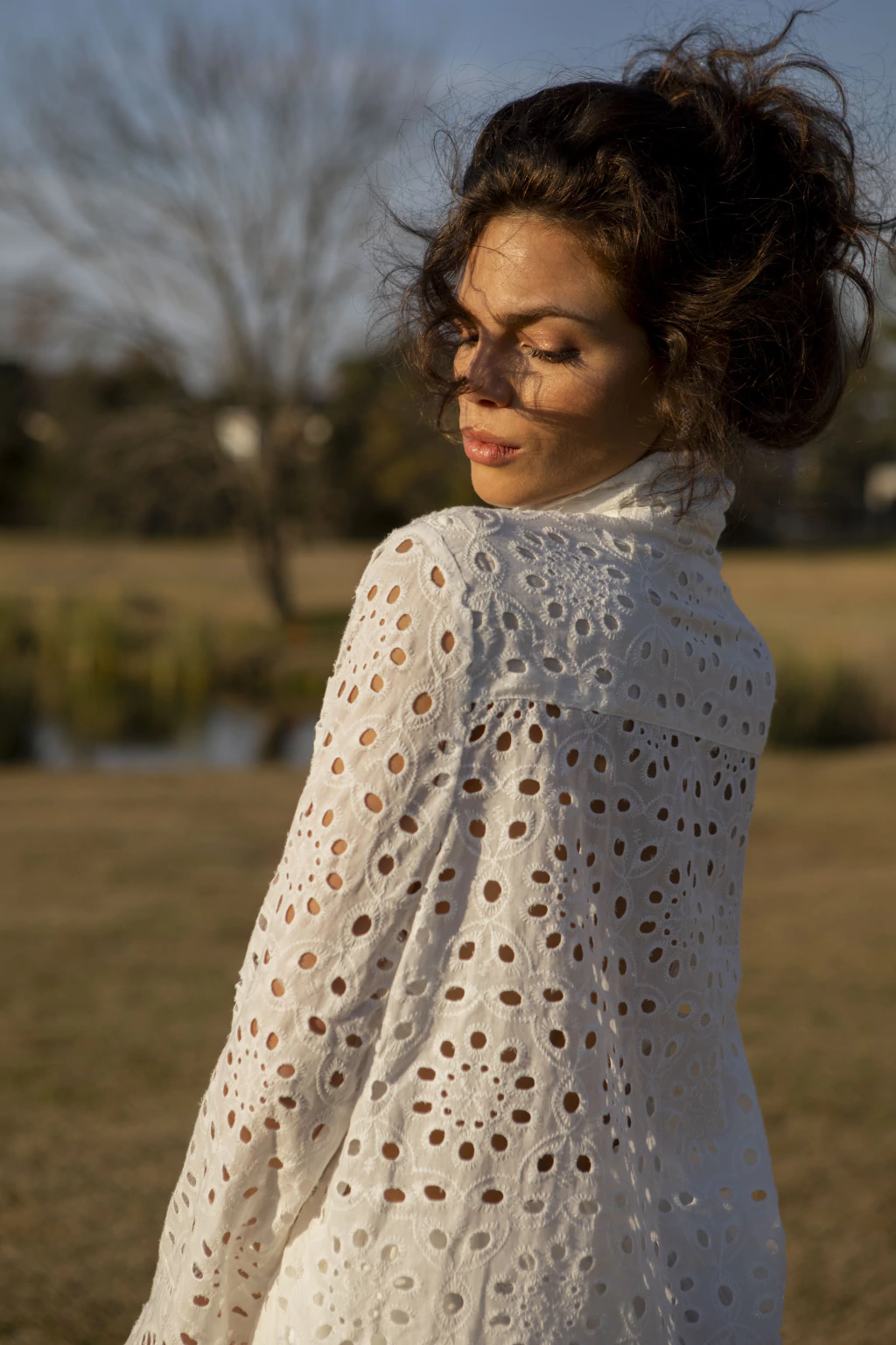 Camisa de manga larga con bordado calado, cuello clásico y cierre con botones, confeccionada en tela liviana.