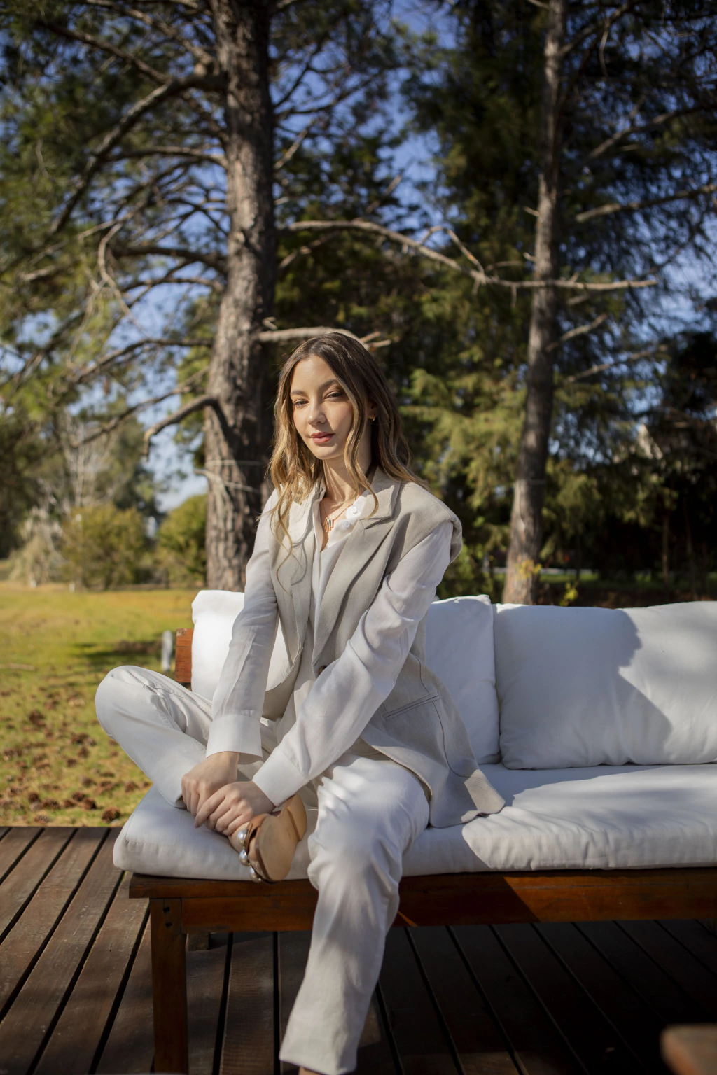 Chaleco sastrero en lino natural, de corte recto y un botón frontal. Atemporal, fresco y perfecto para looks de media estación o superposiciones elegantes.