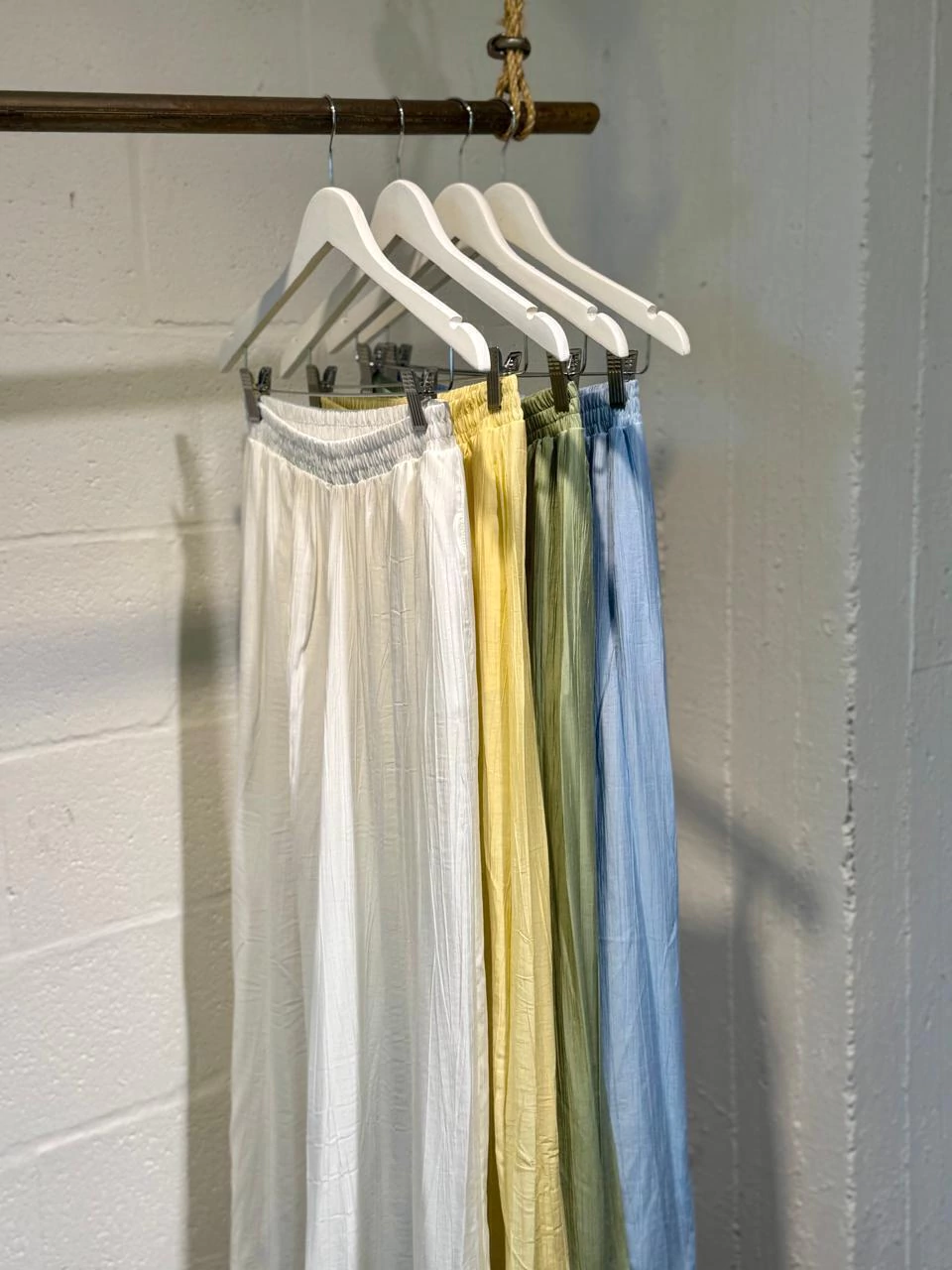 Pantalón de arrugadito wang, con cintura elastizada y caída amplia y liviana. De textura fluida y aireada, ofrece comodidad y movimiento, ideal para looks frescos de verano. Un básico versátil y fácil de combinar, disponible en tonos suaves y naturales.