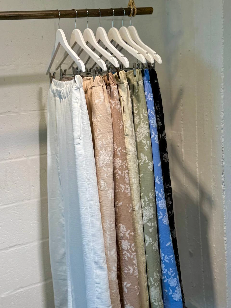 Pantalones amplios con cintura elastizada, confeccionados en tela liviana con delicado bordado floral. Disponibles en una paleta de tonos neutros y pasteles, ideales para looks frescos y femeninos. Cómodos, versátiles y elegantes, perfectos para el día a día o para un outfit de verano con estilo.