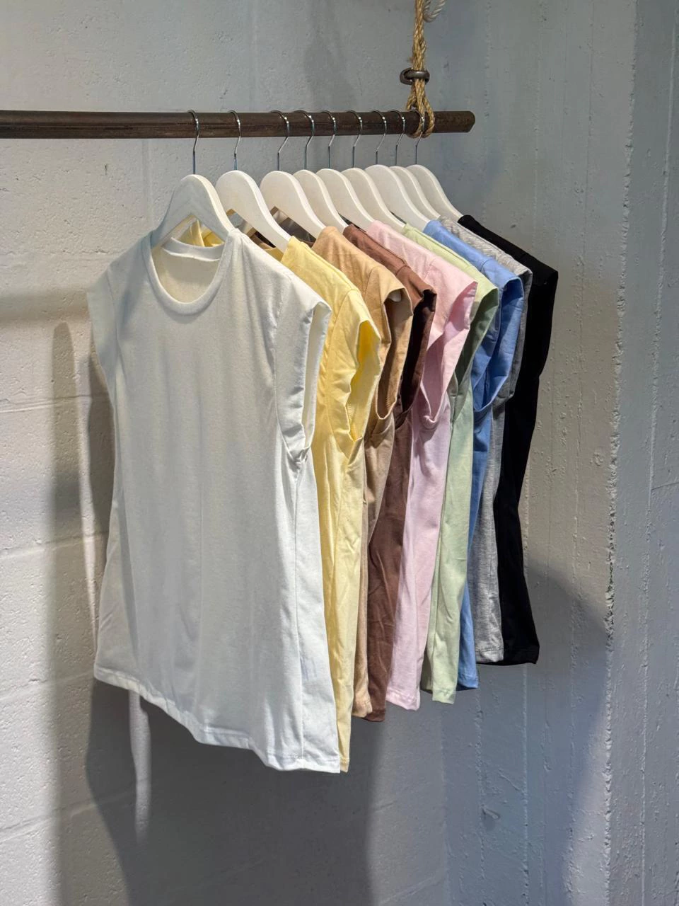 Remera básica sin mangas de corte recto y cuello redondo. Confeccionada en tejido suave y liviano, es una prenda cómoda y versátil para todos los días. Disponible en una amplia variedad de colores pasteles y neutros.