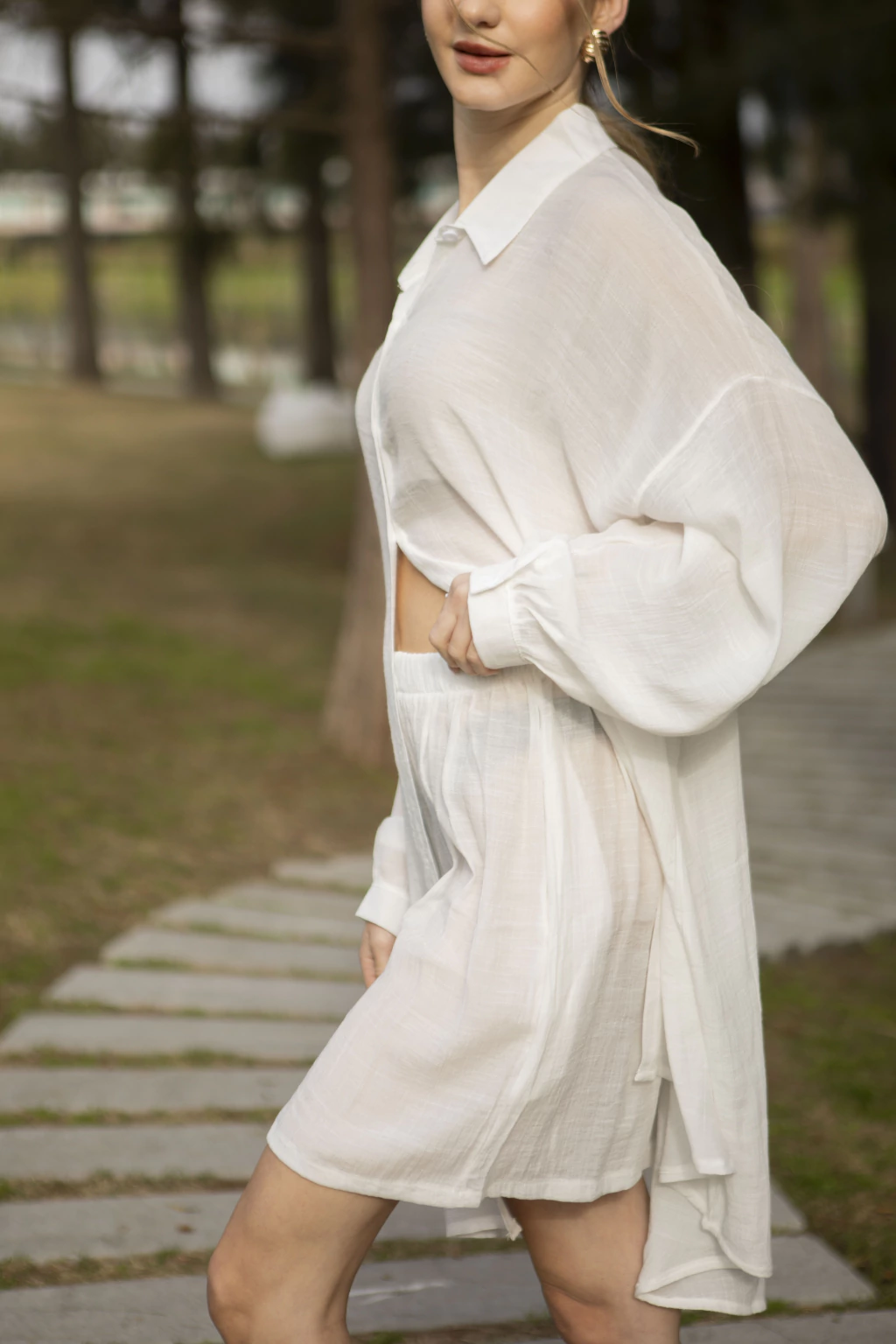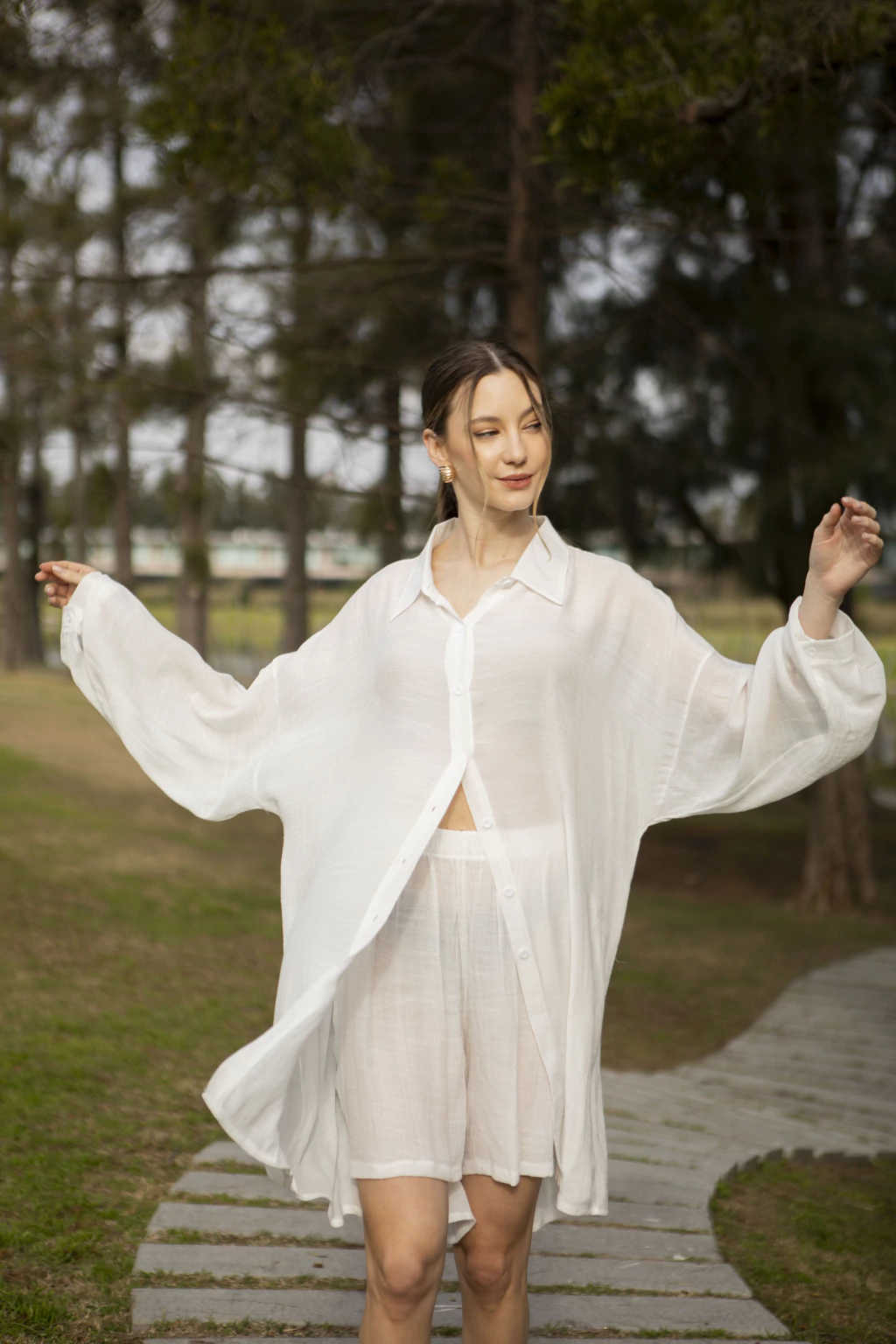 Conjunto ligero de dos piezas, con camisa oversize abotonada y short a juego, ideal para un look fresco y relajado.