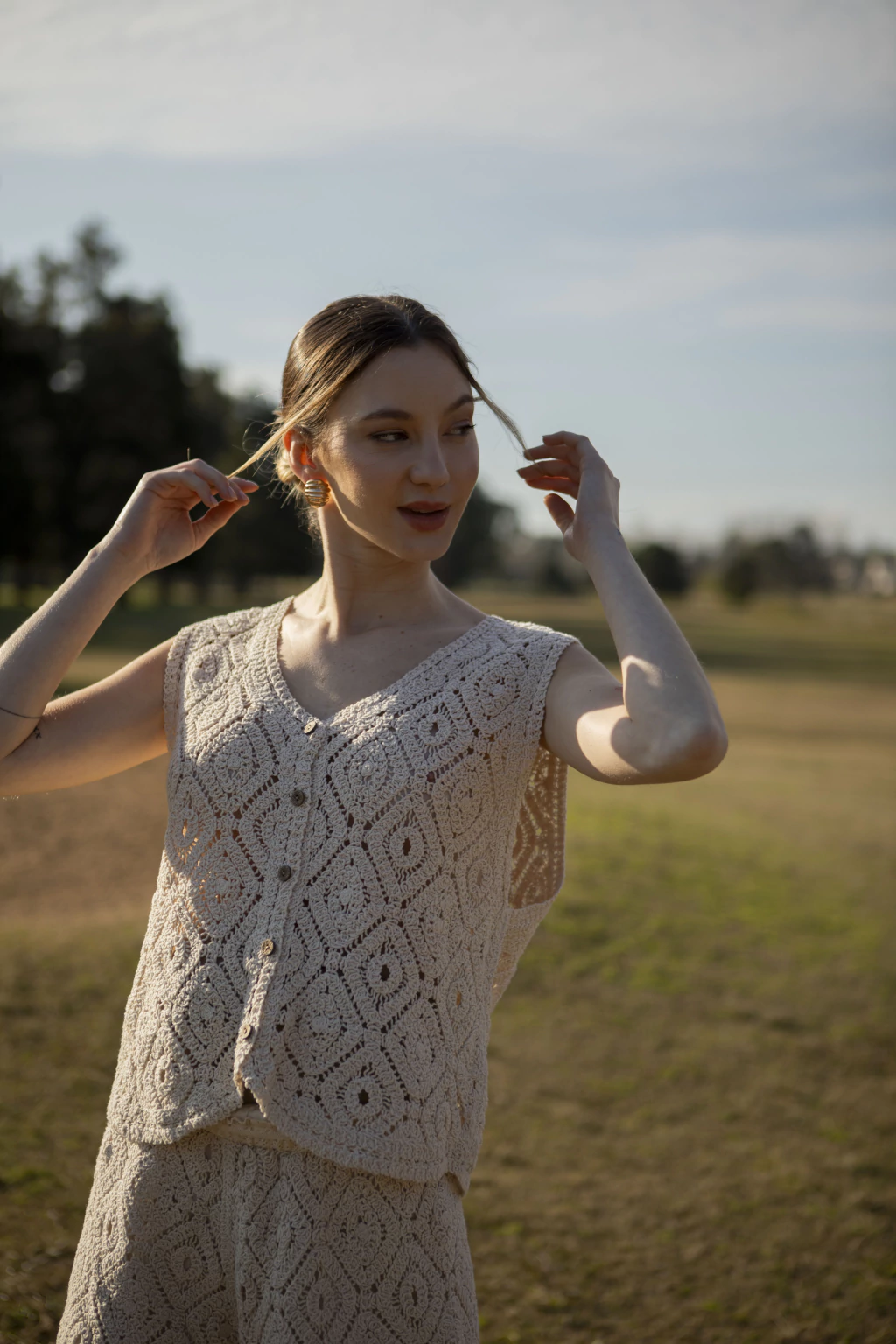 Set tejido a crochet con blusa sin mangas y botones frontales, combinado con short a juego.