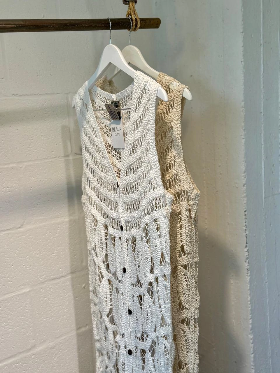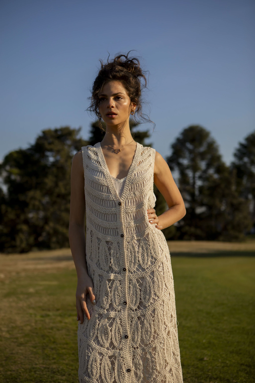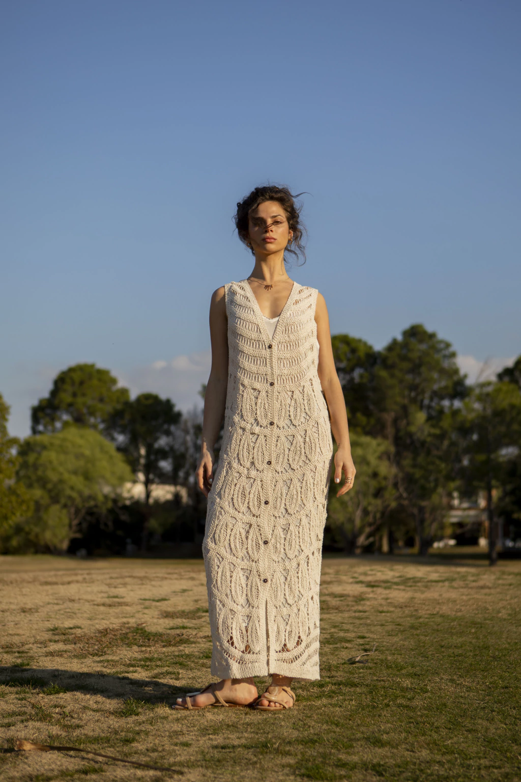 Vestido largo sin mangas, tejido a crochet con diseño calado y botones frontales.