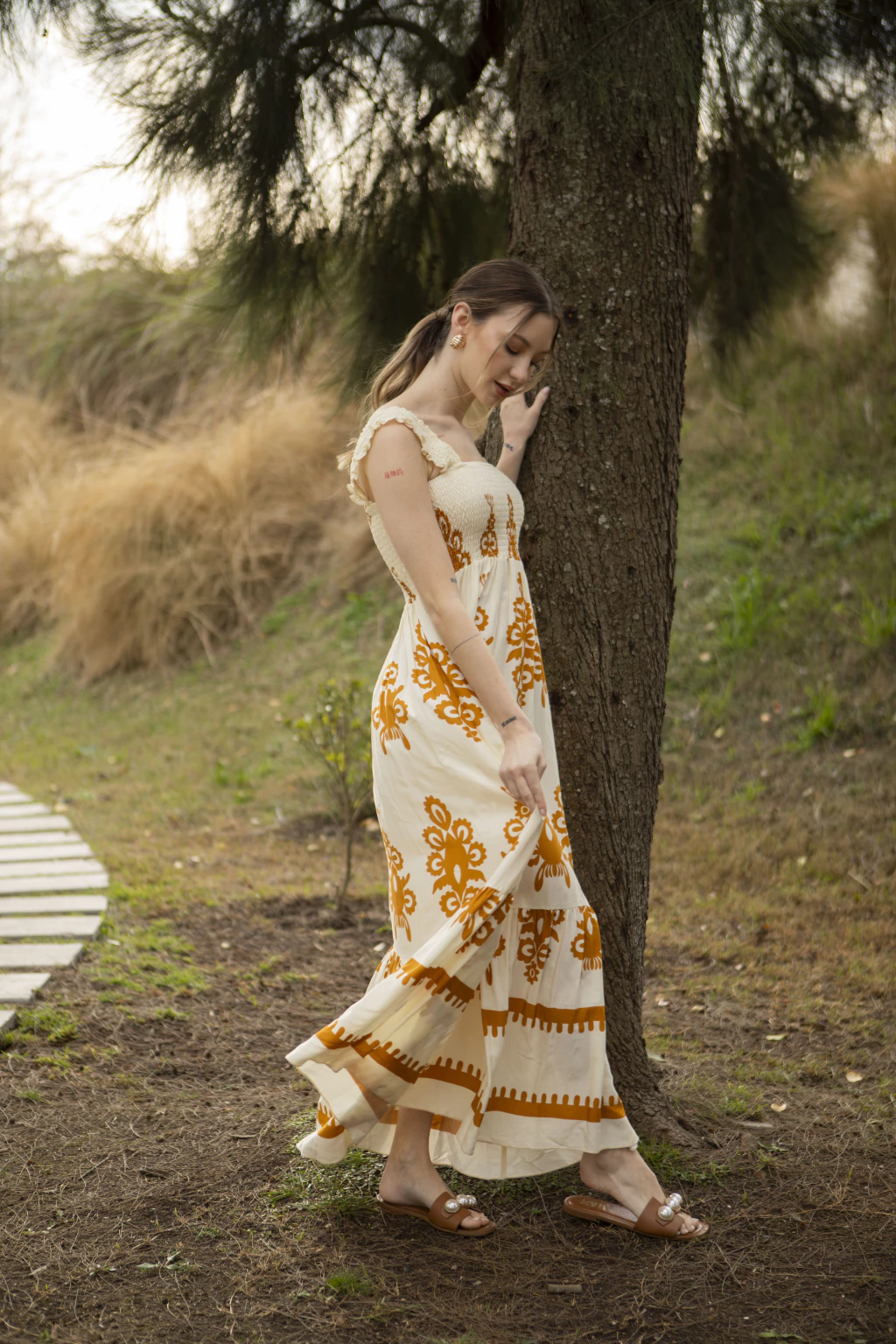 Vestido largo con breteles, frunce en el busto y estampado geométrico de estilo boho